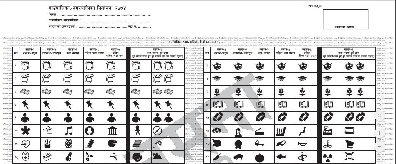 काठमाडौं, १ जेठ ।  मतपत्र १ । त्यसमा ३ सय ७४ फरक निर्वाचन चिन्ह । काठमाडौं जिल्लाका काठमाडौं महानगरपालिकाका र विभिन्न नगरपालिकाहरुका लागि भएको निर्वाचनमा यति ठूलो मतपत्र बनाइयो कि मतदातालाई स साना कोठाको चिन्ह खोज्नै हम्मे पर्यो । आँखा तिरिमिरि भए ।