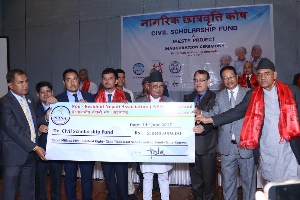 गैर–आवासीय नेपाली संघ थाइल्याण्डका अध्यक्ष खगेन्द्रराज ढकालले उपप्रधानमन्त्री तथा शिक्षा मन्त्री गोपालमान श्रेष्ठको उपस्थितिमा उक्त कोषका लागि ३५ लाख ८९ हजार नौ सय ९९ रुपैयाँ बराबरको चेक नागरिक अभियान नामक संस्थालाई हस्तान्तरण गरेका छन् ।