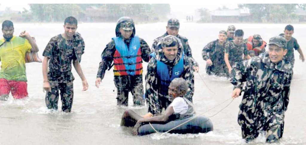पीडितहधको उद्धारका लागि २६ हजार ७ सय व्यक्ति प्रत्यक्ष तथा अप्रत्यक्ष रूपमा खटिएका छन् । बेपत्ताहरूको खोजी, उद्धार र राहत वितरणका लागि सेनाका ७ र ६ निजी हेलिकोप्टरसहित मोटरबोट र रबर्टबोट प्रयोग गरिएको गृह मन्त्रालयका प्रवक्ता सुवेदीले बताए । झापाको झापा गाउँपालिका वडा नं. ७ कुचोदह क्षेत्रबाट बाढीपीडित वृद्धको उद्धार गरी सुरक्षित स्थानतर्फ लैजाँदै सेनाका जवान ।