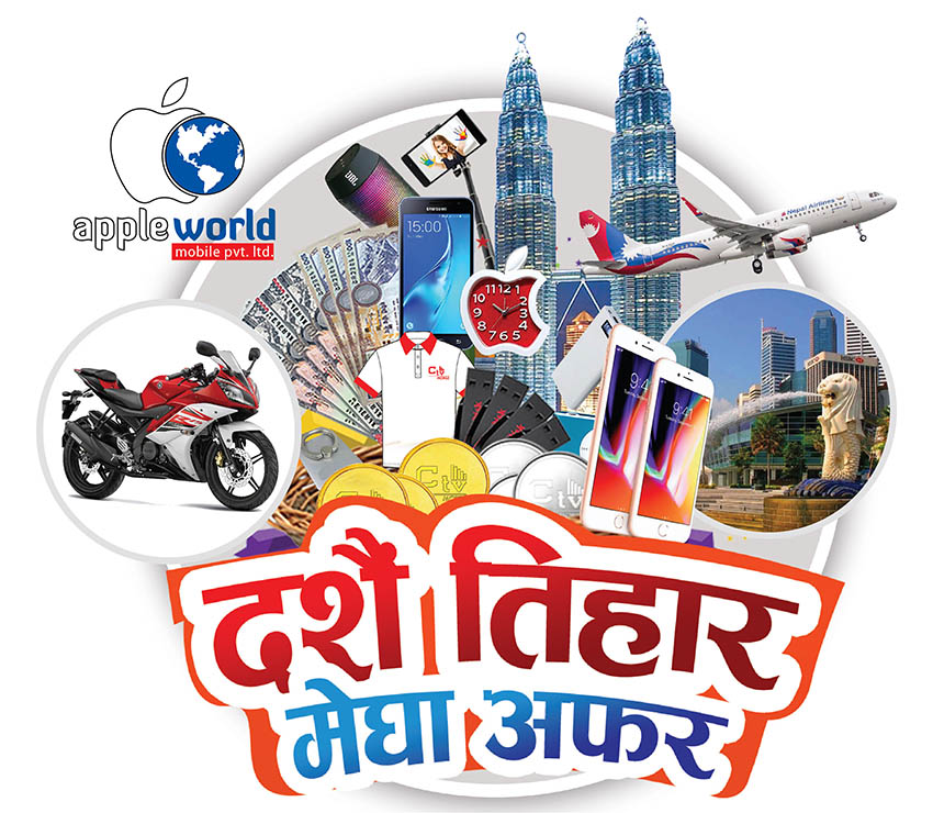मोबाइलका मोडल अनुसार ६० प्रतिशतसम्म छुट पाइने एप्पल वल्र्डमा बम्पर उपहार स्वरूप एकजनाले ‘आरवान फाइभ बाइक’, एकजनाले ‘आइफोन ८’ र एकजनाले ‘मलेसिया र सिंगापुरको टुर’लक्की ड्र मार्फत पाउने छन् । एप्पल वल्र्ड मोबाइलमा जस्तोसुकै मोबाइल एक्सचेन्ज गरिनुका साथै ‘फेस टु फेस मोबाइल मर्मत’को सुविधा समेत ग्राहकले पाउने छन् ।