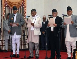 एमालेबाट ईश्वर पोखरेल रक्षा मन्त्री, डा।युवराज खतिवडा अर्थ मन्त्रीमा नियुक्त भएका छन् । त्यस्तै माओवादी केन्द्रबाट रामबहादुर थापा बादल गृहमन्त्री र मातृकाप्रसाद यादव उधोग मन्त्रीमा नियुक्त भएका छन् । उनीहरुलाई आजै राष्ट्रपती विद्यादेवी भण्डारीले एक बिशेष सभाको आयोजना गरि पद तथा गोपनियताको सपथ ग्रहण गराएकी हुन् ।