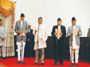 राष्ट्रपति विद्यादेवी भण्डारीले सोमबार नै नवनियुक्त मन्त्रीहरूलाई पद तथा गोपनीयताको शपथ गराएकी छन् । राष्ट्रपति कार्यालय शीतलनिवासमा प्रधानमन्त्री ओलीको उपस्थितिमा नवनियुक्त चार मन्त्रीलाई पद तथा गोपनीयताको शपथ गराइएको हो ।