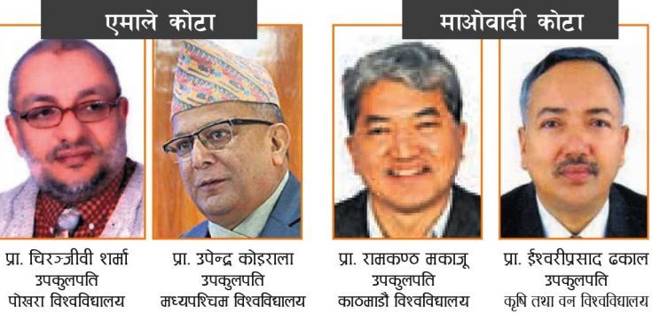इन्जिनियरिङ अध्ययन संस्थानमा त्रिरत्न बज्राचार्य र व्यवस्थापनमा डिल्लीराज शर्मा एमालेको कोटामा डिन बने । माओवादीका तर्पmबाट विज्ञान तथा प्रविधि अध्ययन संस्थानमा रामप्रसाद खतिवडा र मानविकीमा शिवप्रसाद भुसाल नियुक्त भए ।