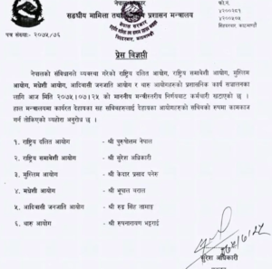 दलित आयोगमा पुरुषोत्तम नेपाल, समावेशी आयोगमा सुरेश अधिकारी र मुस्लिम आयोगमा केदार प्रसाद पनेरुलाई जिम्मेवारी दिइएको छ ।