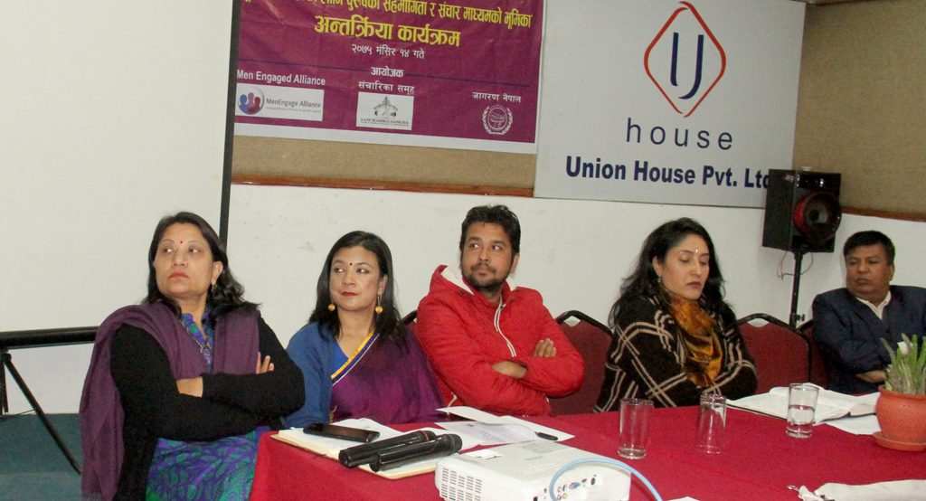 जागरण नेपाल, सञ्चारिका समूह र मेन (पुरुष) इन्गेज अलाइन्सको आयोजनामा भएको ‘लैङ्गिक समानताका लागि पुरुष सहभागिता र सञ्चार माध्यमको भूमिका’ विषयको अन्तरक्रियामा आयुक्त तिम्सिनाले नेपालमा लैङ्गिक हिंसाको अन्त्यको लागि सञ्चार माध्यमको भूमिका सबैभन्दा महत्वपूर्ण भएको बताउनुभयो ।