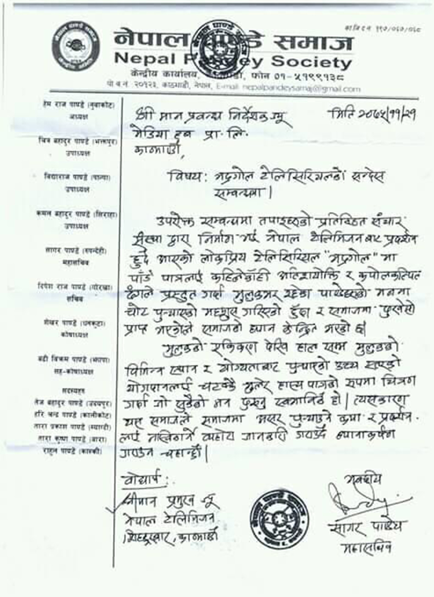 उक्त चरित्रप्रति विरोध गर्दै ‘नेपाल पाँडे समाज’ ले कार्यक्रम उत्पादक मिडिया हबलाई पत्र पठाएको हो ।