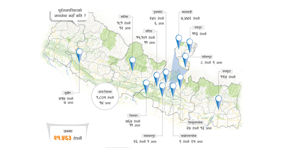पूर्वराजा वीरेन्द्र र उनको परिवारका नाममा देशभर २१ हजार ५ सय ६३ रोपनी जमिन भेटिएको छ । नेपाल ट्रस्ट अन्तर्गत ल्याए पनि सरकारले सदुपयोग गर्न सकेको छैन । दुरुपयोग रोक्न लागिपरेको पनि छैन ।
