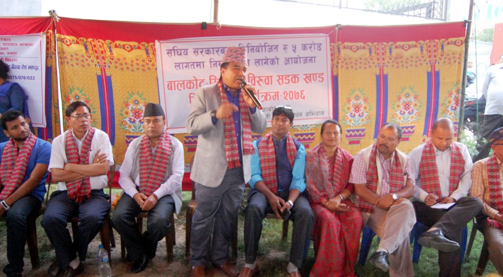 बालकोट सिरुटार हुँदै बिरुवा पुग्ने सडक विस्तार र कालोपत्रे गर्ने काम सोमबारदेखि सुरु भएको छ । सङ्घीय सरकारले छुट्ट्याएको ६ करोड रुपैयाँ बजेटले उक्त सडक विस्तार हुन लागेको हो । पूर्वउद्योगमन्त्री एवं भक्तपुर-२ का प्रतिनिधिसभा सांसद बस्नेतको पहलमा उक्त सडक विस्तार आयोजनको शिलान्यास गर्नुभएको हो ।