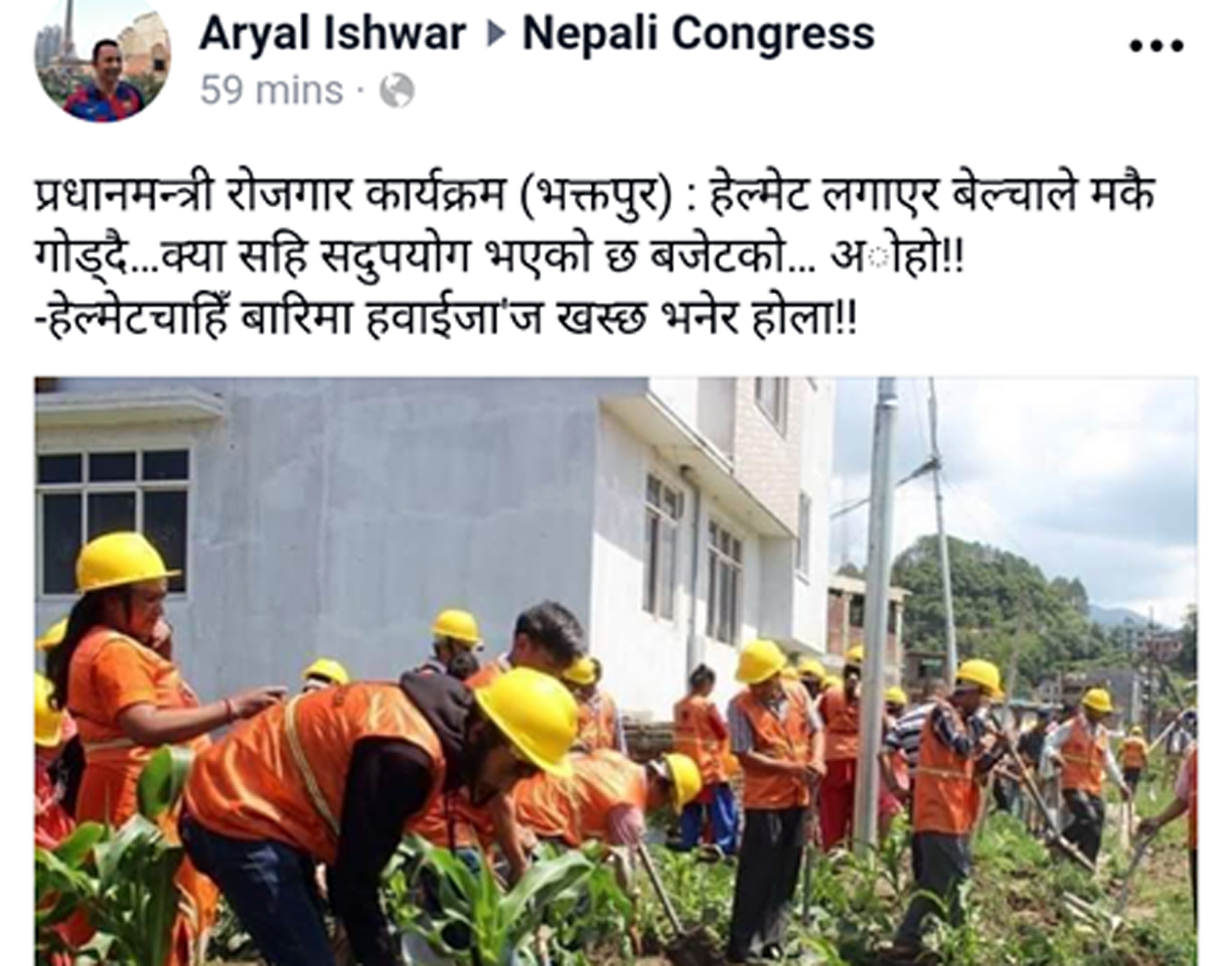 काठमाडौँ, २५ जेठ । सवै नेपाली नागरिकलाई रोजगारीको ज्ञारेन्टी गर्दै रोजगारीको निम्ती विदेशीनुपर्ने बाध्यताको अन्त्य गर्ने मूख्य उद्देश्यका साथ शुरु गरिएको प्रधानमन्त्री रोजगार कार्यक्रमको सरकारको राम्रो काम देखेर आत्तिएका व्यक्ति वा समूहद्वारा समाजिक सञ्जालमा गलत प्रचार गरिएको भन्दै आपत्ती जनाईएको छ ।
