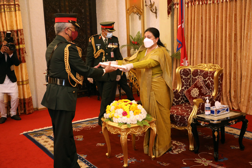 बिहीबार राष्ट्रपति विद्यादेवी भण्डारीबाट नेपाली सेनाको मानार्थ महारथीको उपाधि ग्रहण गरेका नरवणेले राष्ट्रपति भण्डारीसँग बिहीबार नै शिष्टाचार भेटवार्ता गरेका थिए ।