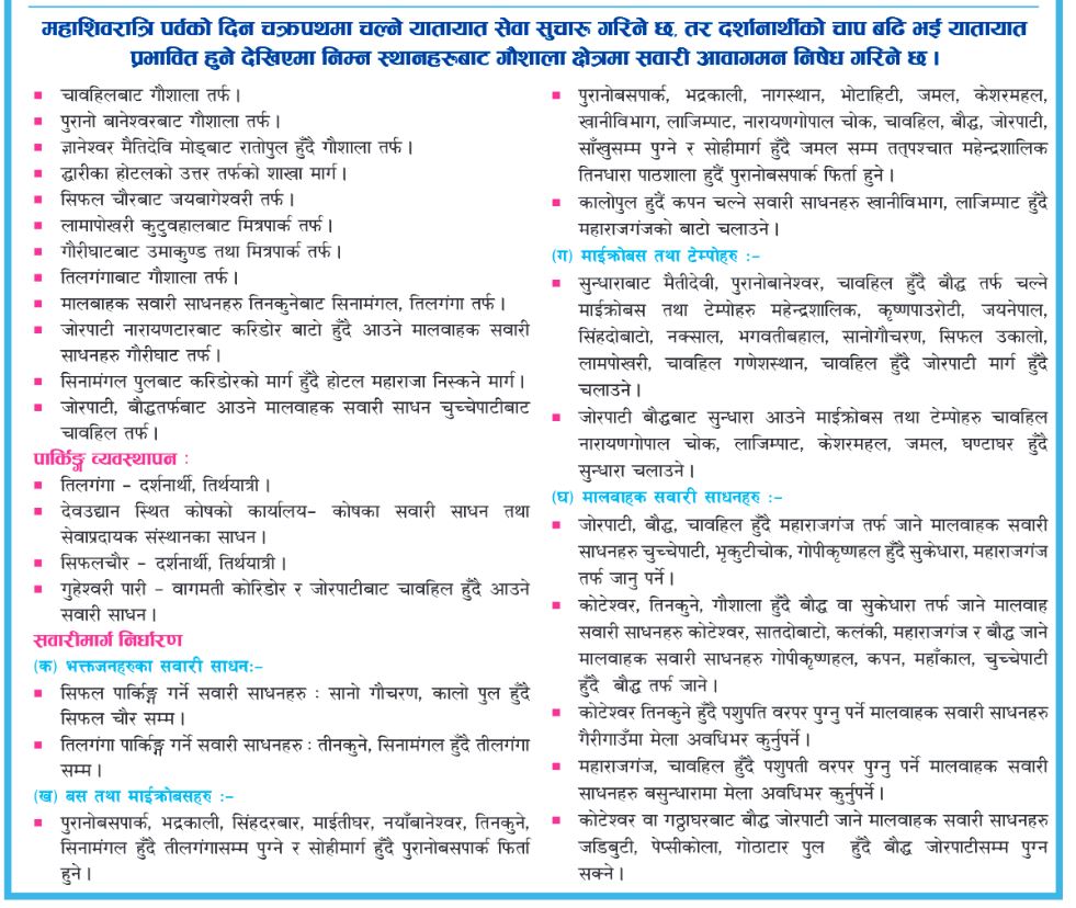 शिवरात्रीका दिन यी स्थानमा सवारी चल्न नपाउने (सूचनासहित)