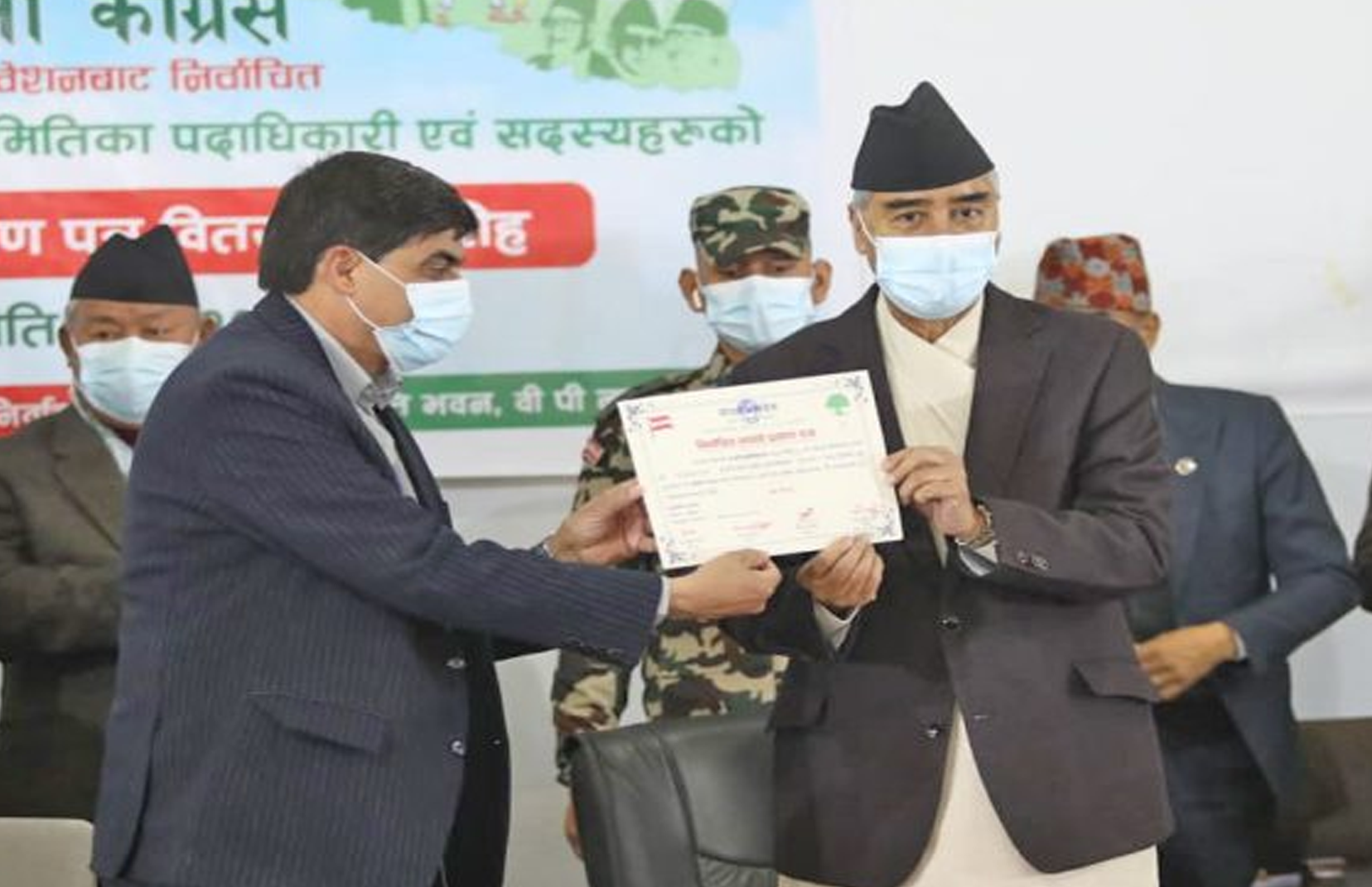 केन्द्रीय निर्वाचित समितिका संयोजक गोपालकृष्ण घिमिरेले आज पार्टी केन्द्रीय कार्यालय सानेपामा आयोजित एक कार्यक्रमका बीच पार्टीको १४ औं महाधिवेशनबाट निर्वाचित सभापति शेरबहादुर देउवासहितका पदाधिकारी र केन्द्रीय सदस्यहरुलाई प्रमाणपत्र वितरण गरेका हुन् । गत मङ्सिर २४ देखि २८ गतेसम्म काठमाडौँमा सम्पन्न कांग्रेस महाधिवेशनअन्तर्गत भएको निर्वाचनबाट केन्द्रीय कार्यसमितिका १३४ पदाधिकारी र सदस्य निर्वाचित भएका छन् ।