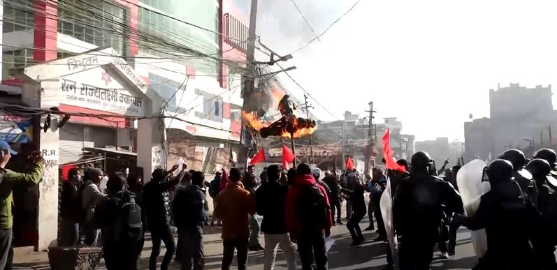काठमाडौँ, १३ माघ । शिक्षामन्त्री शिशिर खनालको राजीनामा माग गर्दै नेकपा (एकीकृत समाजवादी) निकट विद्यार्थी संगठन अनेरास्ववियुले पुत्ला दहन गरेको छ ।