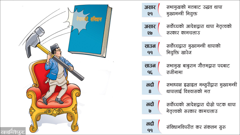 संसदीय निर्वाचनपछि २०७९ पुस १० मा बनेको सत्ता गठबन्धनको विघटनसँगै कोशीमा संविधानमाथि बलमिच्याइँ सुरु भएको हो । एमाले, माओवादी, राप्रपा, रास्वपा, जसपालगायत दल मिलेर केन्द्रमा बनेको गठबन्धन करिब दुई महिनामै भत्किए पनि कोशीमा भने जेठ तेस्रो सातासम्म कायमै थियो । एमाले संसदीय दलका नेता हिक्मतकुमार कार्की असार १५ सम्म मुख्यमन्त्री रहे । यसको एकमात्र कारण थियो– माओवादी र जसपा सरकारबाट बाहिरिँदा पनि नयाँ गठबन्धनलाई सरकार निर्माणका लागि बहुमत सांसद नपुग्नु । ९३ सदस्यीय कोशी प्रदेशसभामा कांग्रेस, माओवादी, एकीकृत समाजवादी र जसपासँग बहुमत (४७) सांसद त थिए, तर उक्त संख्यामा सभामुखसमेत सामेल रहेकाले बहुमत पुग्दैनथ्यो । संसद्मा विश्वासको मत पाउन नसकी असार १५ मा मुख्यमन्त्री कार्की पदमुक्त भएपछि कोशीमा संविधानको यही दफामाथि पहिलो पटक धावा बोल्ने काम भयो । असार २१ मा तत्कालीन सभामुख बाबुराम गौतमको समेत समर्थनमा कांग्रेस संसदीय दलका नेता उद्धव थापा मुख्यमन्त्री नियुक्त भए । तर सर्वोच्चले असार २७ मा उनको नियुक्तिमाथि संवैधानिक आशंका गर्दै कामचलाउ हैसियतमा झार्यो । एमाले संसदीय दलका नेता हिक्मतकुमार कार्कीद्वारा दायर रिटमाथि प्रारम्भिक सुनुवाइ गर्दै न्यायाधीश सपना मल्ल प्रधानको इजलासले भन्यो, ‘मुद्दाको अन्तिम किनारा नभएसम्म दीर्घकालीन असर पर्ने कुनै पनि निर्णय नगर्नू/नगराउनू ।’