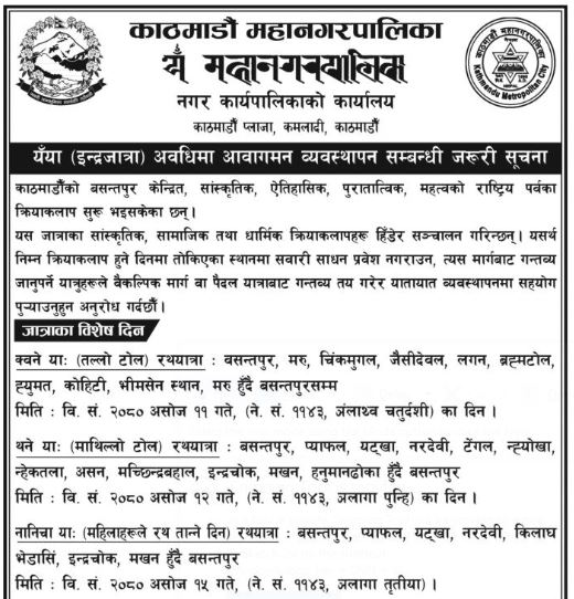​​​​​​​काठमाडौँ, १५ असोज इन्द्रजात्राको अवसरमा आयोजना गरिने जात्राका कारण आज काठमाडौँका केही स्थानमा सवारी साधन आवागमन प्रभावित हुने भएको छ ।