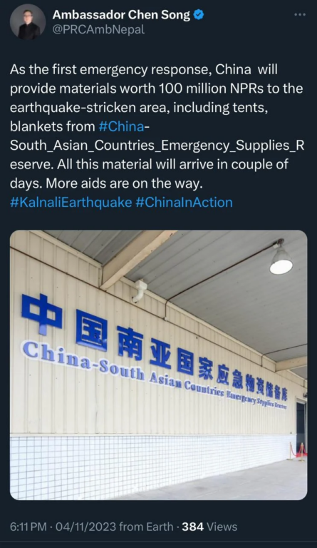 नेपाललाई १० करोड बराबरको राहत सामग्री दिने चीनको घोषणा
