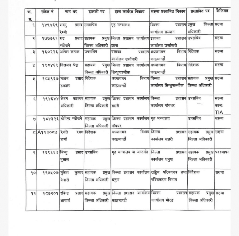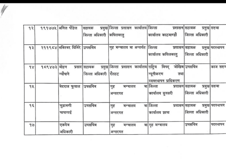 काठमाडौँ, १३ पौष । आठ जना सहायक प्रमुख जिल्ला अधिकारीसहित गृह मन्त्रालय अन्तरगत कार्यरत १७ जना उपसचिवको सरुवा भएको छ ।