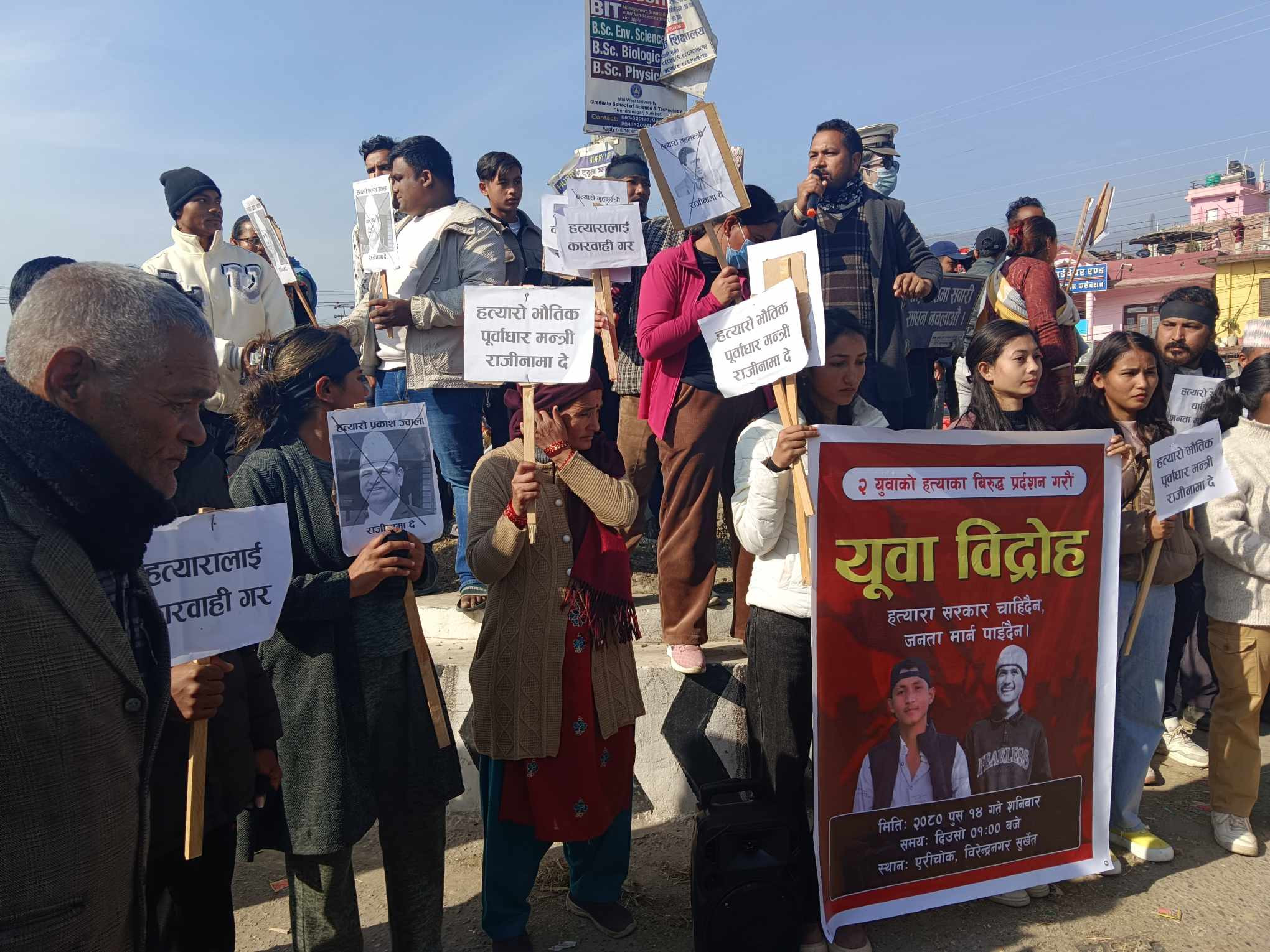 मृतकका आफन्त तथा विभिन्न राजनीतिक दलका युवाहरूले सडकमा टायर बालेर गृहमन्त्री नारायणकाजी श्रेष्ठ र भौतिक पूर्वाधारमन्त्री प्रकाश ज्वालाको समेत राजीनामा माग्दै प्रदर्शन गरिरहेका छन् ।