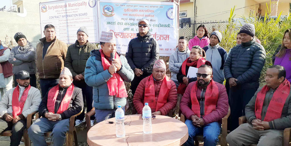 कार्यक्रममा सूर्यविनायक नगरपालिकाका प्रमुख वासुदेव थापाले सो सडकमा नगरपालिकाले ६०/४० को अवधारणा अनुसार ढल निर्माण लगायतका काम गरिएको जानकारी दिनुभयो । विकास निर्माणको कार्य सम्पन्न भएको २४ घण्टा वित्न नपाउँदै नगरपालिकाले भत्तानि गर्ने प्रतिवद्धता जनाउँदै निर्माण कार्यलाई दिगो, गाुणस्तरीय तथा प्रभावकारी ढंगले गर्न निर्माण कम्पनीलाई आग्रह गर्नुभयो । कार्यक्रममा अध्यक्षता वडाध्यक्ष पुष्पराज बस्नेतले गर्नुभएको थियो । उहाँले वर्तमान कार्यकालमा सडक निर्माणमा जनतालाई आवश्यक पर्ने न्युनतम सडकहरु निर्माण गरिसक्ने प्रतिवद्धता जनाउनुभयो । शिलान्यास तथा उद्घाटनले जनतासँग प्रत्यक्ष सम्पर्क गर्ने माध्यम समेत भएकाले स्थानीयवासीले विशेष उत्साहजनक सहभागिता जनाउन र आफुलाई लागेका कुराहरु नेतृत्वलाई जनाकारी गराउनु समेत आग्रह गर्नुभयो ।