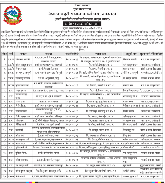 सम्पर्कमा नआएको प्रहरीलाई तत्काल हाजिर हुन आउन आग्रह