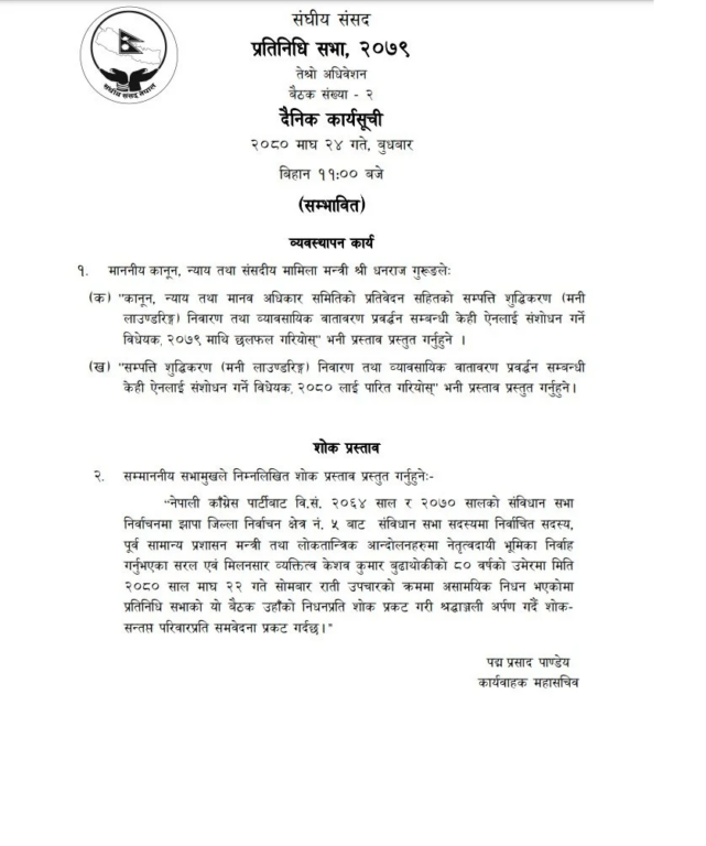 काठमाडौँ, २४ माघ । प्रतिनिधिसभाको बैठक आज बस्दै छ । बैठक बिहान ११ बजेका लागि बोलाइएको संसद् सचिवालयका कार्यवाहाक महासचिव पद्म प्रसाद पाण्डेयले जानकारी दिए ।