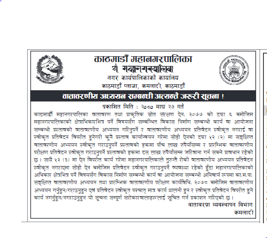 काठमाडौँ, २७ माघ । काठमाडौँ महानगरपालिकाले वातावरणीय अध्ययन प्रतिवेदन स्वीकृत नगराई वा स्वीकृत प्रतिवेदन विपरीत कुनै प्रस्ताव कार्यान्वयन गरेमा कारबाही गर्ने चेतावनी दिएको छ ।