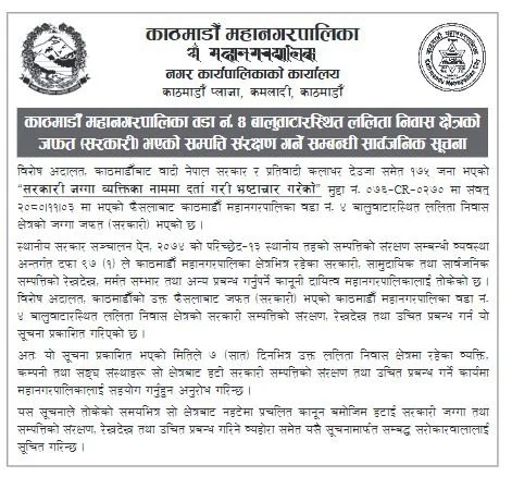 विशेष अदालतको फैसलासँगै उक्त जग्गा सरकारी भएको भन्दै महानगरले एक सूचना जारी गर्दै सात दिनभित्र ललिता निवास क्षेत्रमा रहेका व्यक्ति, कम्पनी तथा संघसंस्थाहरूलाई उक्त क्षेत्रबाट हट्न भनेको हो । तोकेको समयभित्र सो क्षेत्रबाट नहटेमा प्रचलित कानुन बमोजिम हटाई सरकारी जग्गा तथा सम्पत्तिको संरक्षण, रेखदेख तथा उचित प्रबन्ध गरिने चेतावनी समेत महानगरले दिएको छ ।