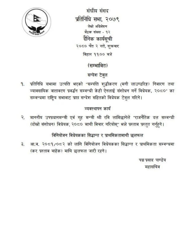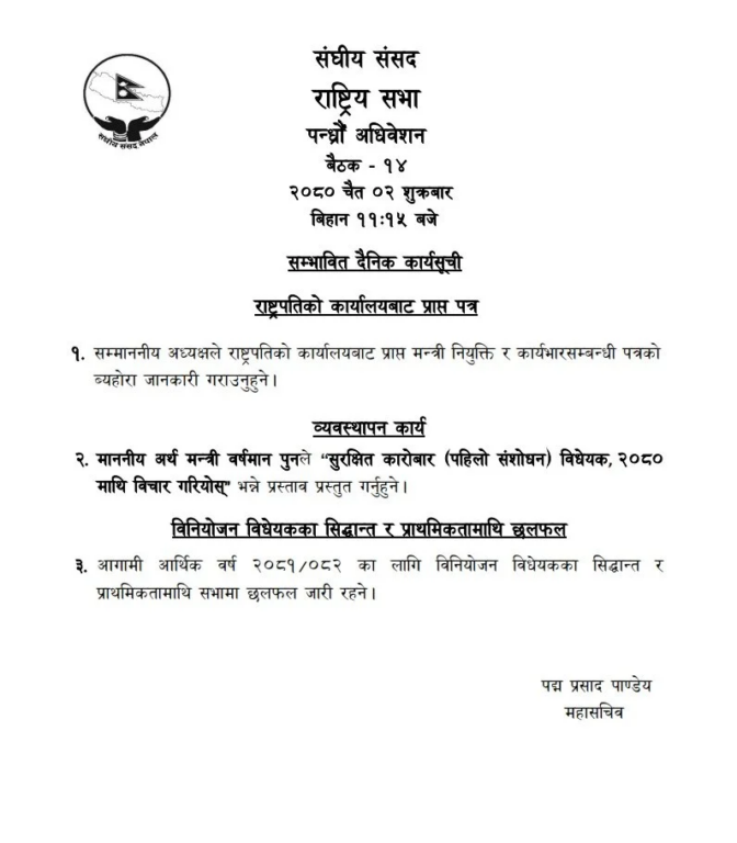 काठमाडौँ, २ चैत । संसद्का दुवै सदनको बैठक आज बस्दै छ । प्रतिनिधि सभा र राष्ट्रिय सभा बैठक बस्न लागिएको हो । संसद् भवन नयाँ बानेश्वरमा आज बिहान ११ बजे प्रतिनिधि सभा बैठक बस्नेछ भने राष्ट्रियसभा बैठक बिहान ११ बजेर १५ मिनेटमा बस्नेछ ।