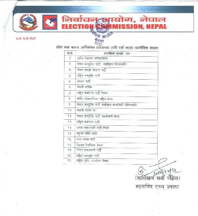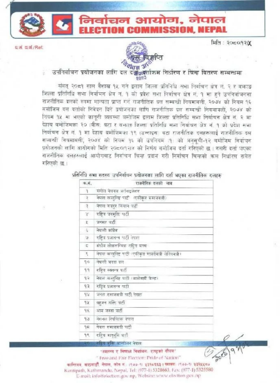 आयोगका प्रवक्ता शालिग्राम शर्मा पौडेलले सोमबार विज्ञप्ति जारी गर्दै राजनीतिक दल सम्बन्धी नियमावली बमोजिम निर्वाचन प्रयोजनको लागि दर्ता गरिएको र यसरी दर्ता भएका राजनीतिक दलहरुलाई निर्वाचन चिह्न प्रदान गरी निर्वाचन चिह्नको क्रम निर्धारण समेत गरिएको जानकारी दिए ।