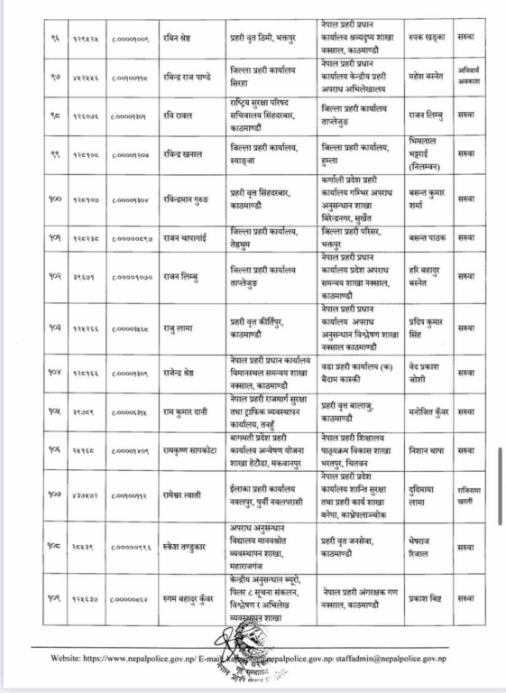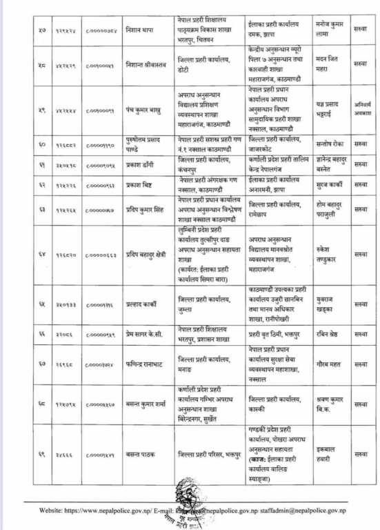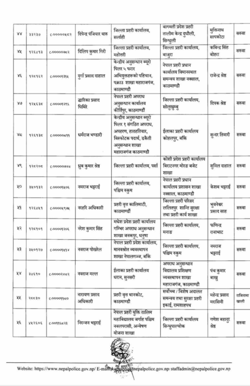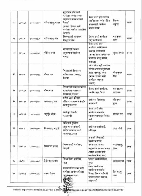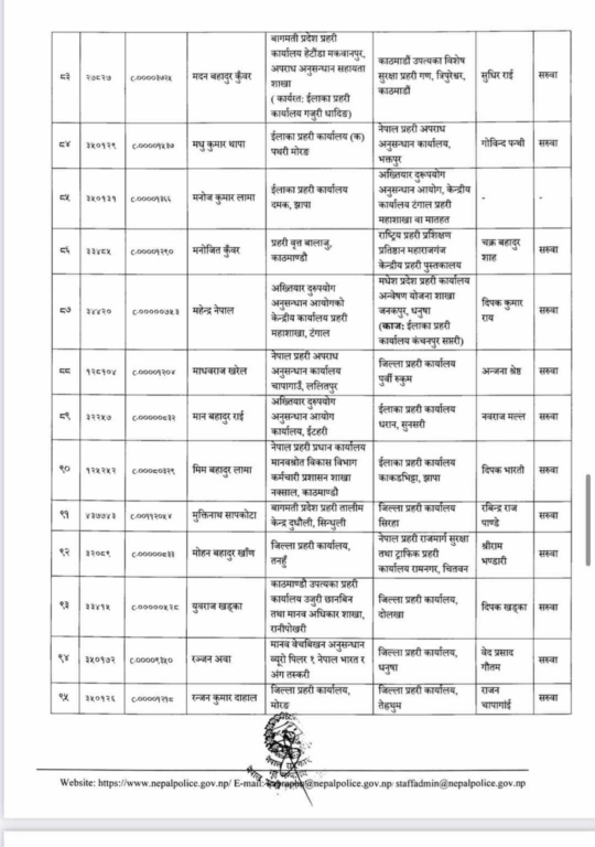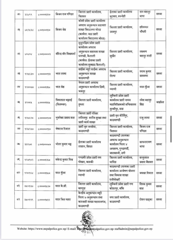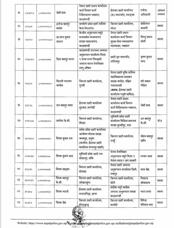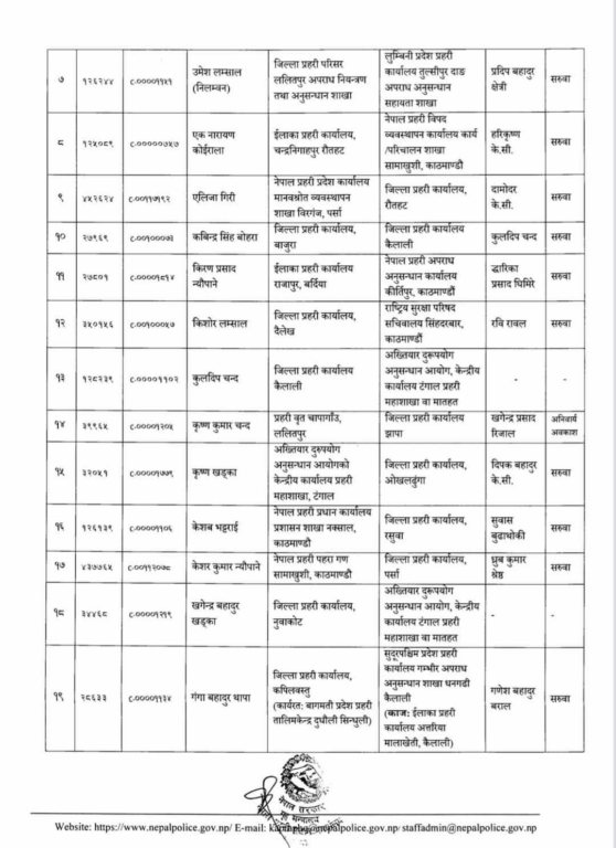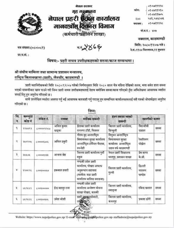 प्रहरी महानिरीक्षकको चैत ०७ गतेको निर्णयअनुसार मिति २०८० साल चैत्र महिना देखिको तलब, भत्ता समेत हाल सरुवा भएको दरबन्दीबाट खान पाउने गरी प्रहरी नायव उपरीक्षकहरूलाई सरुवा गरिएको सूचनामा उल्लेख छ ।