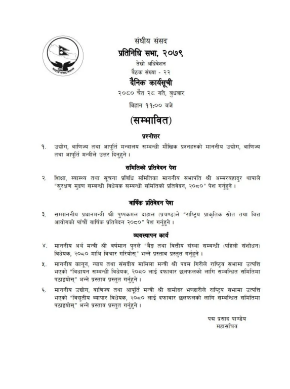 काठमाडौँ, २८ चैत । सङ्घीय संसद्अन्तर्गत प्रतिनिधिसभाको बैठक आज बस्दै छ । मंगलबार स्थगित भएको बैठक आज बिहान ११ बजेका लागि बोलाइएको हाे ।