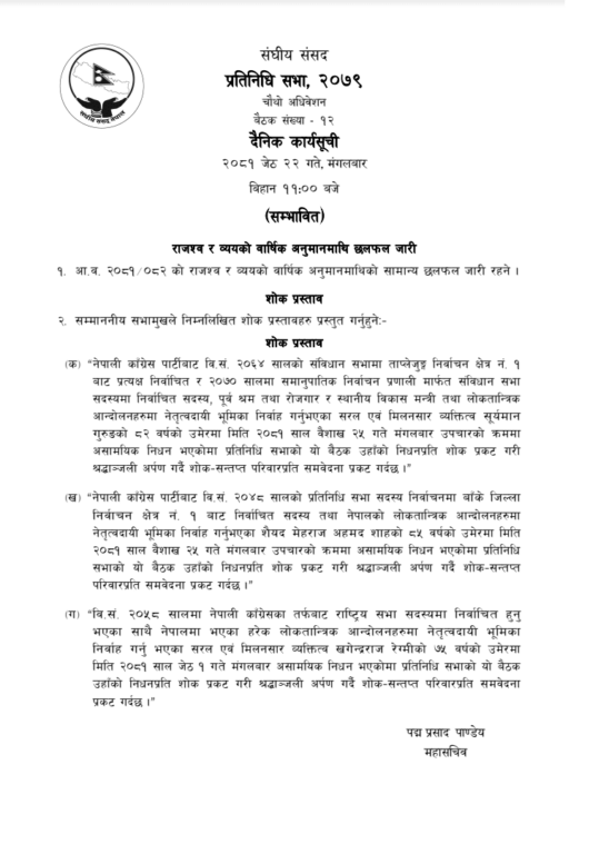 काठमाडौँ, २२ जेठ । सङ्घीय संसद्अन्तर्गत प्रतिनिधिसभाको बैठक आज पनि बस्दै छ । बैठक बिहान ११ बजेका लागि बोलाइएको छ ।