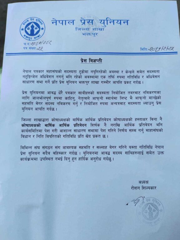 प्रेस युनियनका जिल्ला सभापति तथा महासंघका उपाध्यक्षसमेत रहेका सुन्दर सिल्पकारले एक विज्ञप्ती जारी गर्दै नेतृत्वले महासंघको विधान विपरित जवरजस्त अधिवेशन गरेको आरोप लगाएको छ । सदस्यतामा आफन्त, स्वार्थ, नियोजित तथा गुटवाद चलाएको भन्दै युनियनले विज्ञप्ती मार्फत नेतृत्वलाई गम्भीर आरोप लगाएको छ ।