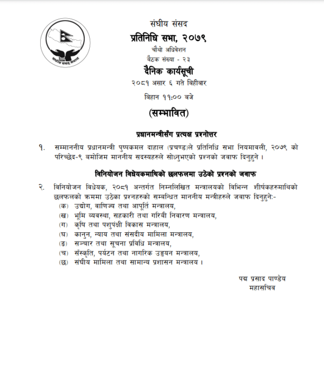 काठमाडौँ, ६ असार । सङ्घीय संसद्अन्तर्गत प्रतिनिधिसभा बैठक आज पनि बस्ने भएको छ । बिहान ११ बजेका लागि बोलाइएको बैठकमा आज प्रधानमन्त्री पुष्पकमल दाहाल ‘प्रचण्ड’ले  सांसदहरूले उठाएका प्रश्नको जवाफ दिने भएका छन् ।