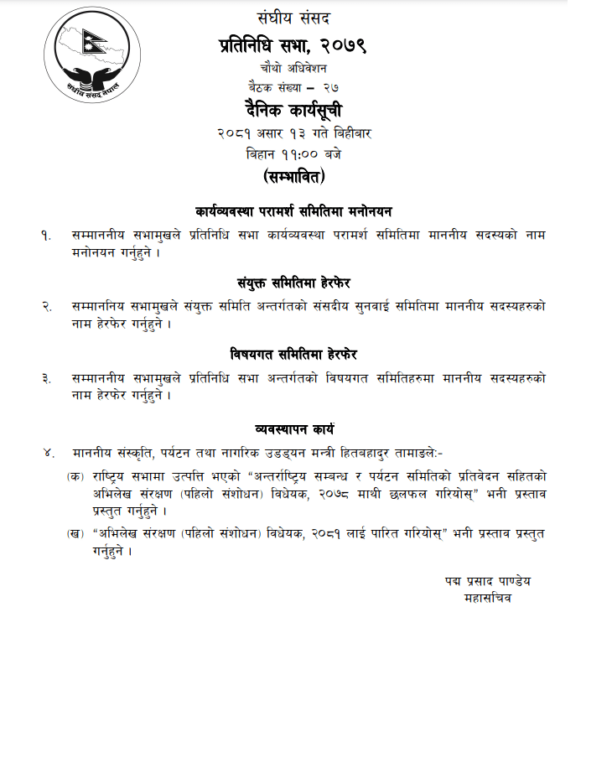 बिहान ११ बजे बैठकमा सभामुखले प्रतिनिधिसभा कार्यव्यवस्था परामर्श समितिमा सदस्यको नाम मनोनयन गर्ने, संयुक्त समितिअन्तर्गतको संसदीय सुनवाइ समितिमा सदस्यहरूको नाम हेरफेर गर्ने सम्भावित कार्यसूची छ ।