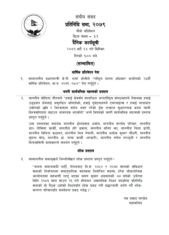काठमाडौँ, १३ भदौ । सङ्घीय संसद् प्रतिनिधिसभाको बैठक आज बस्दै छ । दिउँसो १ बजे बस्ने बैठकमा प्रधानमन्त्री केपी शर्मा ओलीले राष्ट्रिय मानव अधिकार आयोगको २३औँ वार्षिक प्रतिवेदन आर्थिक वर्ष २०७९–०८० पेस गर्ने कार्यसूची छ ।