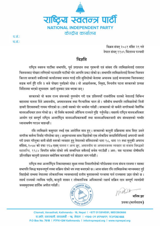 काठमाडौँ, २१ मंसिर । राष्ट्रिय स्वतन्त्र पार्टीले सभापति तथा पूर्व उपप्रधान तथा गृहमन्त्री रवि लामिछानेलाई रातारात चितवनबाट पोखरा लगिएको घटनाप्रति पार्टीको घोर आपत्ति प्रकट गरेको छ ।