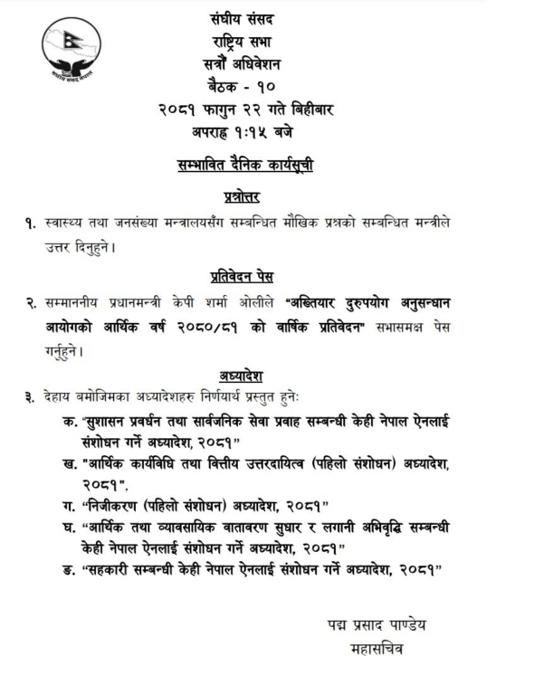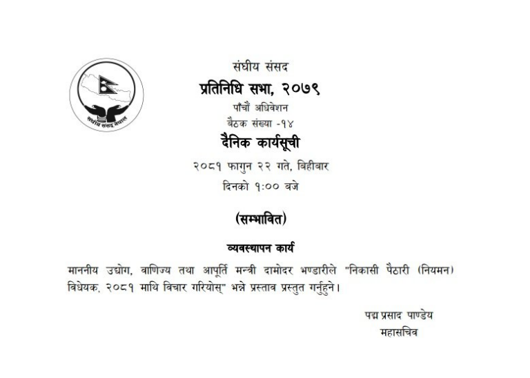 काठमाडौँ, २२ फागुन । संघीय संसद्अन्तर्गत दुवै सदनको बैठक आज बस्दै छ । प्रतिनिधिसभाको बैठक दिउँसो १ बजे र राष्ट्रियसभाको बैठक दिउँसो सवा १ बजे बस्नेछ । प्रतिनिधिसभा राष्ट्रियसभा