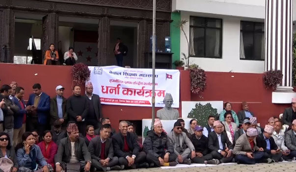 काठमाडौँ, २७ फागुन । नेपाल शिक्षक महासंघ राष्ट्रिय समितिका सदस्यहरूले नेपाली कांग्रेसको पार्टी केन्द्रीय कार्यालयमा धर्ना दिएका छन् ।