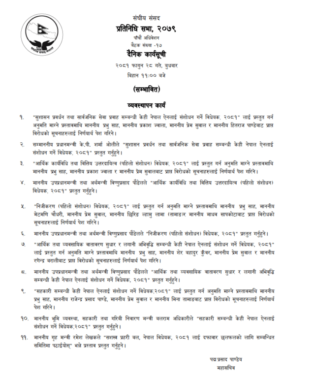 काठमाडौँ, २८ फागुन । प्रतिनिधि सभाको बैठक आज पनि बस्दै छ। बैठक बिहान बिहान ११ बजे संसद् भवन नयाँ बानेश्वरमा बस्नेछ ।