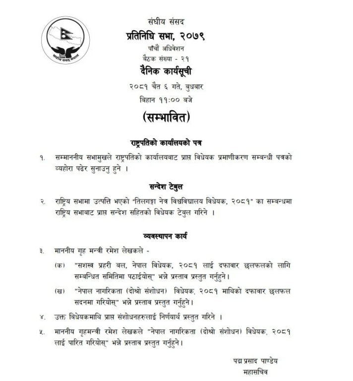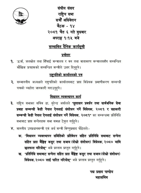 काठमाडौँ, ६ चैत । सङ्घीय संसद्का दुवै सदनको बैठक आज बस्दै छ । प्रतिनिधिसभा बैठक बिहान ११ बजे र राष्ट्रियसभाको बैठक दिउँसो सवा १ बजे बस्ने तय भएको छ । प्रतिनिधिसभा राष्ट्रियसभा