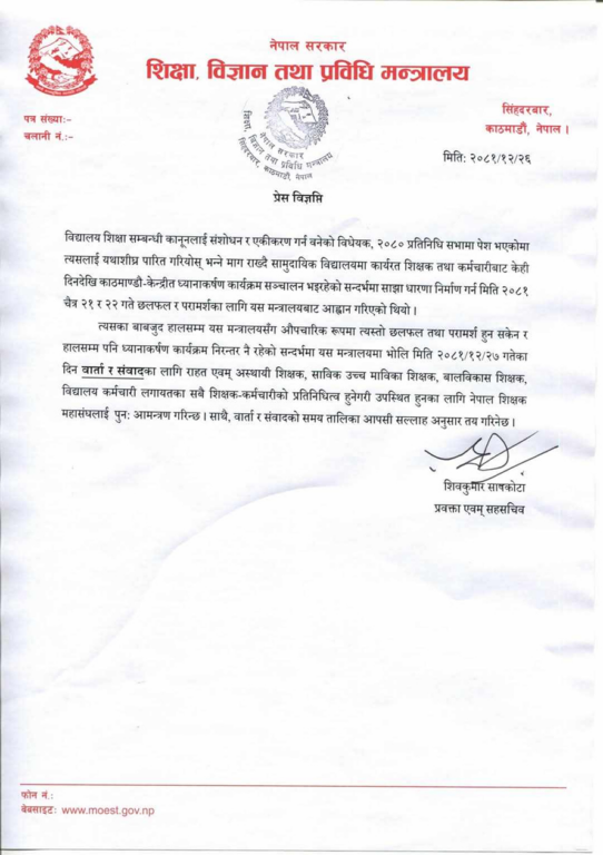 शिक्षा, विज्ञान तथा प्रविधि मन्त्रालयद्वारा मंगलबार जारी गरिएको विज्ञप्तिमा शिक्षकहरूलाई २७ चैत २०८१ को बिहान ११ बजे मन्त्रालयमा उपस्थित हुन अनुरोध गरिएको छ । आन्दोलनरत शिक्षकहरूले भने यसअघि पटक-पटक भएका सम्झौता लागु गर्न माग गर्दै वार्तामा बस्न अस्वीकार गर्दै आएका छन् ।