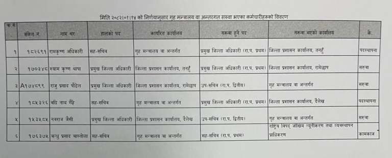 गृह मन्त्रालयका अनुसार तनहुँको प्रमुख जिल्ला अधिकारी बनाएर पठाइएको छ । तनहुँका प्रमुख जिल्ला अधिकारी श्यामकृष्ण थापालाई रामेछापको प्रमुख जिल्ला अधिकारी बनाएर पठाइएको छ । गृह मन्त्रालयमा रहेका सहसचिव बद्रीनाथ गैह्रेलाई दैलेखको प्रमुख जिल्ला अधिकारी बनाएर पठाइएको छ ।