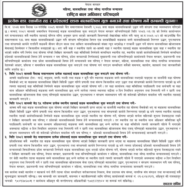 काठमाडौँ, १७ वैशाख । सरकारले नेपाललाई असार मसान्तभित्र सडक बालबालिका मुक्त देश बनाउने तीन चरणको ठोस कार्ययोजना सार्वजनिक गरेको छ ।