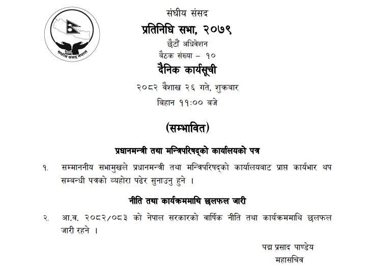 काठमाडौँ, २६ वैशाख । सङ्घीय संसद् अन्तर्गत प्रतिनिधिसभाको बैठक आज पनि बस्दै छ । बिहान ११ बजे बस्ने गरी बैठक बोलाइएको संसद् सचिवालयले जानकारी दिएको छ ।