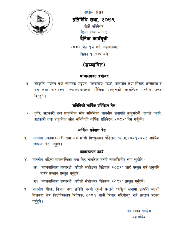 काठमाडौँ, १३ जेठ । प्रतिनिधिसभाको आजको बैठकमा चालु आर्थिक वर्षको आर्थिक सर्वेक्षण पेस हुने भएको छ ।