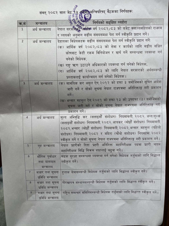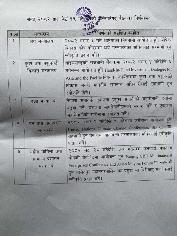 मन्त्रिपरिषद् बैठकका सार्वजनिक १४ वटा निर्णयहरू: