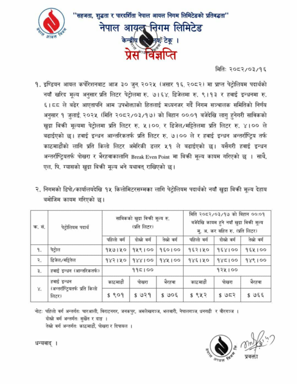 आजदेखि लागू हुने गरी पेट्रोलियम पदार्थको मूल्य बढ्यो