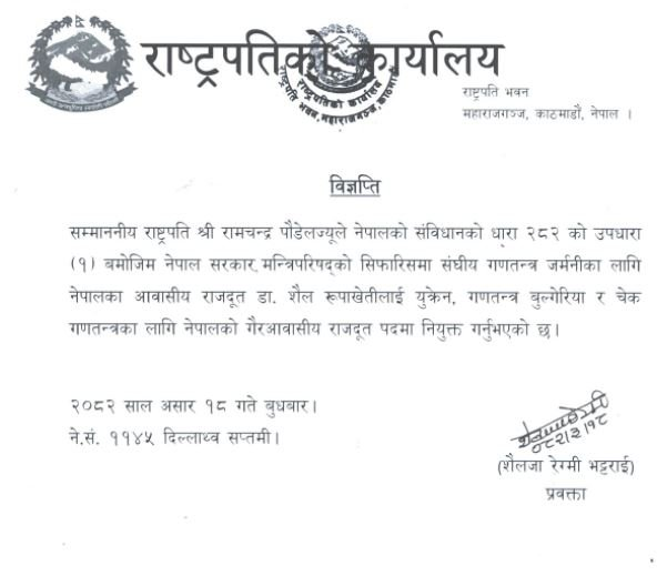 काठमाडौँ, १८ असार । राष्ट्रपति रामचन्द्र पौडेलले संघीय गणतन्त्र जर्मनीका लागि नेपालका आवासीय राजदूत डा.शैल रूपाखेतीलाई युक्रेन, गणतन्त्र बुल्गेरिया र चेक गणतन्त्रका लागि नेपालको गैरआवासीय राजदूत पदमा नियुक्त गरेका छन् ।