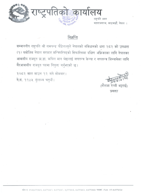 काठमाडौँ, ११ साउन । राष्ट्रपति रामचन्द्र पौडेलले दक्षिण अफ्रिकाका लागि नेपालका आवासीय राजदूत प्रा.डा. कपिलमान श्रेष्ठलाई गणतन्त्र केन्या र गणतन्त्र जिम्बाब्वेका लागि गैरआवासीय राजदूत पदमा नियुक्त गरेका छन् ।